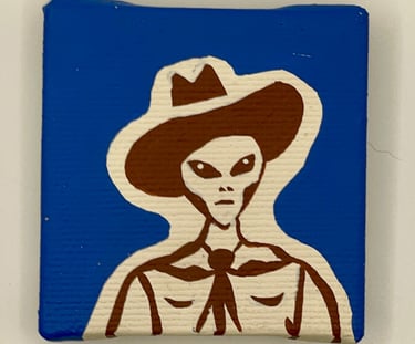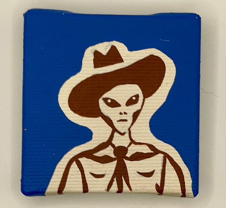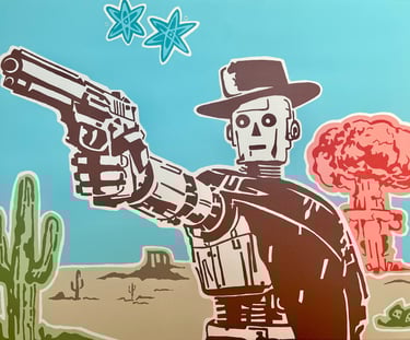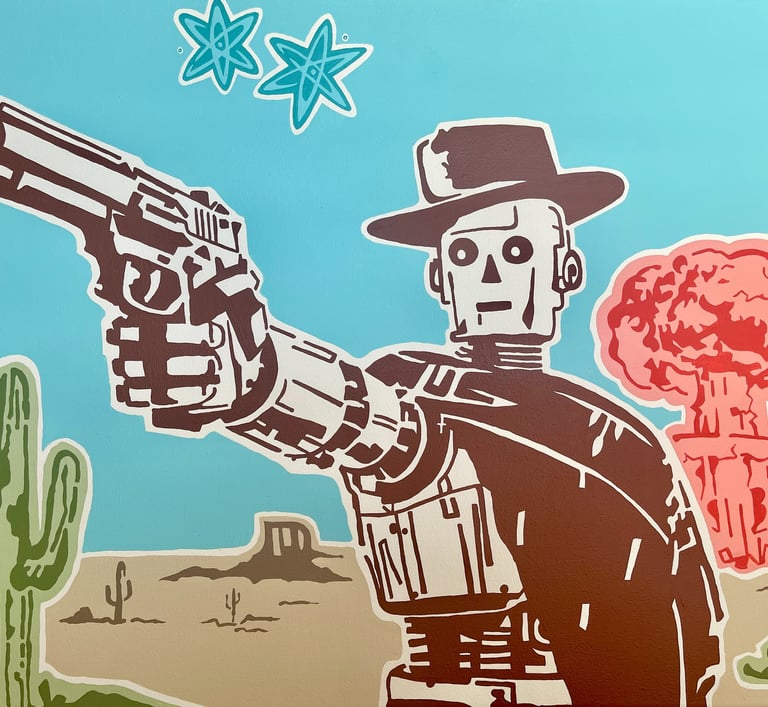 Just as film framed my imagination, my Latin heritage and family experiences gave me a foundation of color, symbolism, and resilience that continue to fuel my work. My paintings fuse these influences—cinema, culture, and lived memory—into bold, graphic-based compositions. Though my aesthetic reflects the precision of printmaking, each original painting is created entirely by hand, no stencils and no digital applications; just an analog process that underscores both discipline and intimacy. With roots in screen printing, I use layered color fields, stark contrasts, and striking imagery to hold a moment in time. At once personal and universal, my work reimagines familiar iconography as reflections on identity, belonging, and the cultural narratives that shape us.