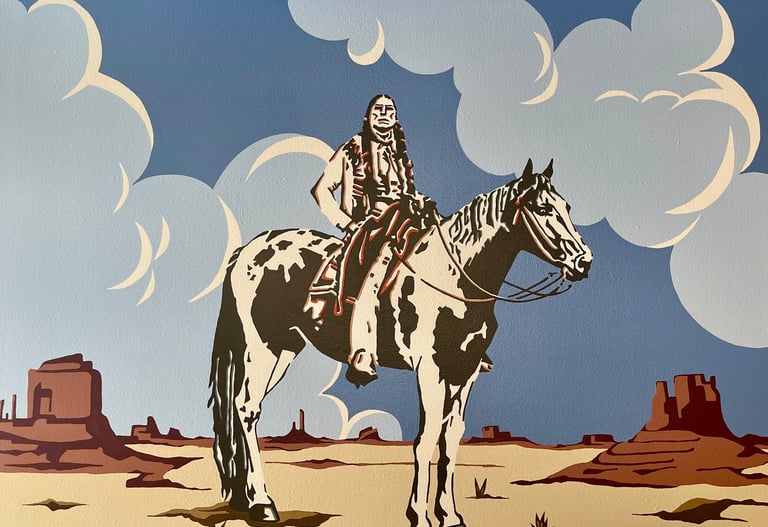 Pueblos Originarios honors Indigenous presence, memory and resilience amid cultural erosion. Through portraits and figures grounded in landscape, the series pairs high-impact palettes with statuesque compositions. Asserting visibility, dignity, and endurance where fading traditions still stand.