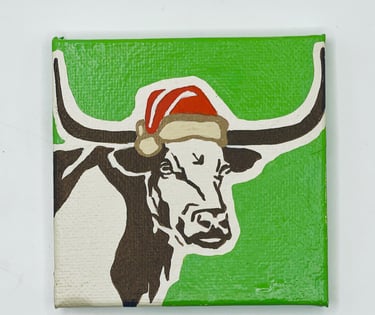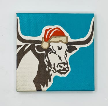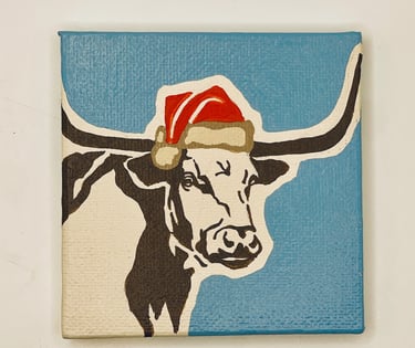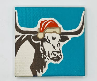 9 Christmas Longhorns, each with a distinct colored backdrop. Every Longhorn is varnished, ready to hang, signed and comes with a Certificate of Authenticity.