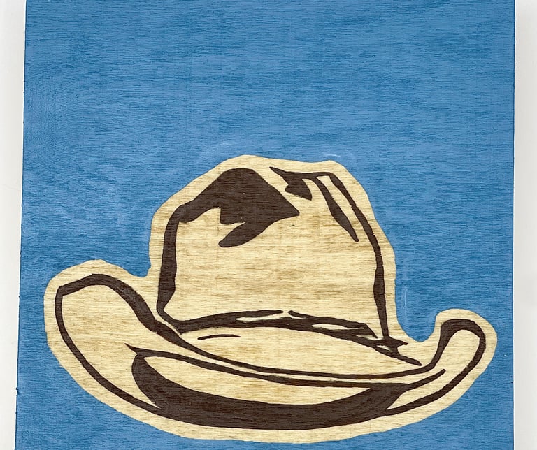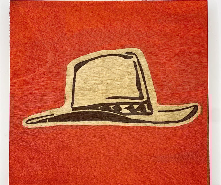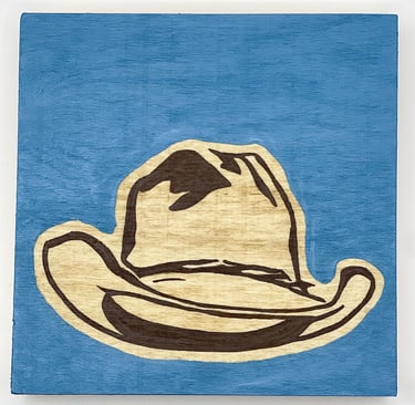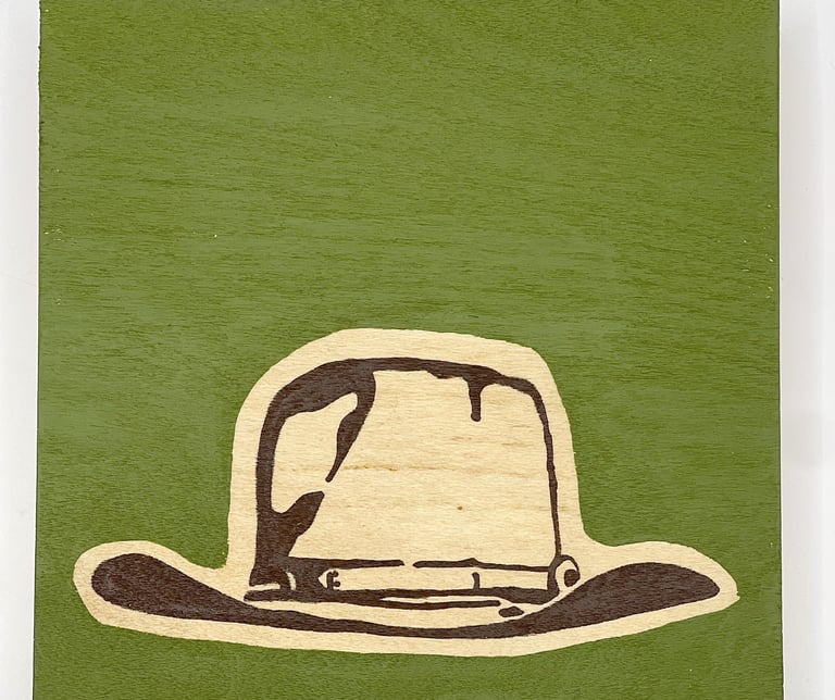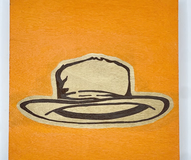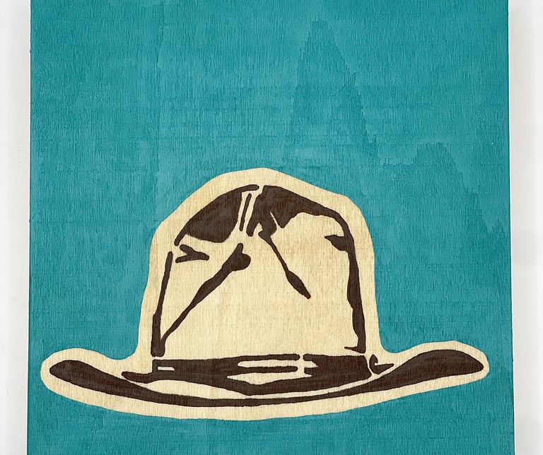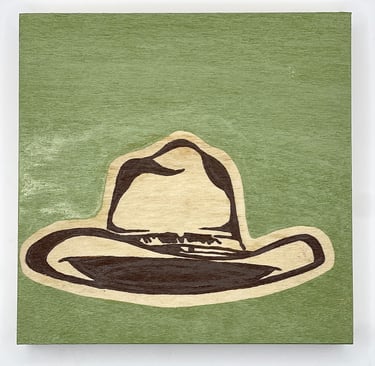 This series focuses on one of the quiet heroes of western cinema: the cowboy hat. Each small painting features an instantly recognizable hat worn by an iconic character, from Clint Eastwood’s The Good, the Bad and the Ugly to John Wayne’s turns in True Grit, The Man Who Shot Liberty Valance, El Dorado, and The Shootist, and Robert Duvall in Lonesome Dove. Stripped of the figure and the storyline, the hat stands alone as a symbol of visibility and character, often signaling the “good guy” before a word is spoken. Rendered on 5" square wood panels with bold, solid backgrounds and exposed wood grain, the simplicity is intentional. These works combine western art and film history, while embracing the power of design, recognition, and myth. Small, approachable, and collectible, each piece celebrates how something as simple as a hat can carry an entire story.