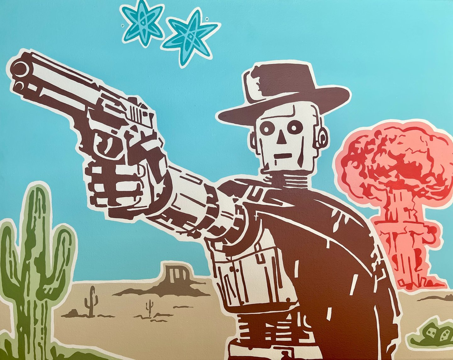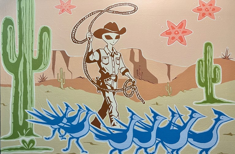 Drawing from classic science fiction folklore and the vivid, illustrative style of mid-century pop culture, the series transforms scenes of chaos into electric, color-saturated compositions. The landscapes are inspired by the raw, untamed beauty of Texas and pulse with irony, nostalgia, and an uneasy sense of wonder. Through its fusion of western iconography, atomic-era aesthetics, and post-apocalyptic fantasy, Frontier Fallout becomes a reflection on the uncertainty of our technological future.