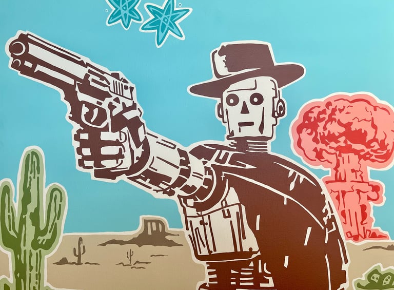 Frontier Fallout explores a reimagined West, a surreal collision of apocalyptic vision, 1950s atomic-age optimism, and the cinematic language of classic westerns. In this series, the frontier meets the fallout of imagined futures: robots duel with cowboys, aliens descend on desert towns, and dinosaurs wander through the dust of a vanished civilization.